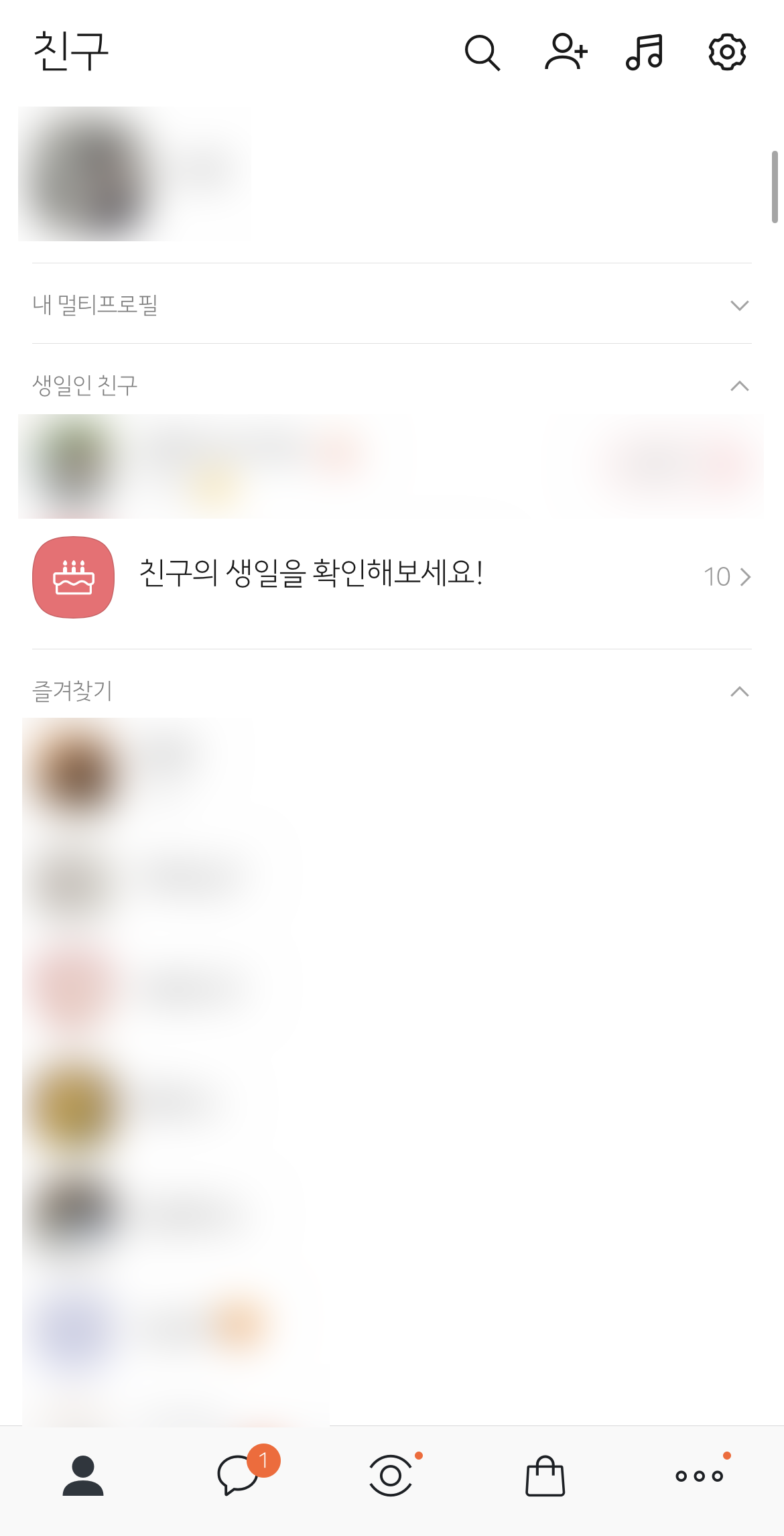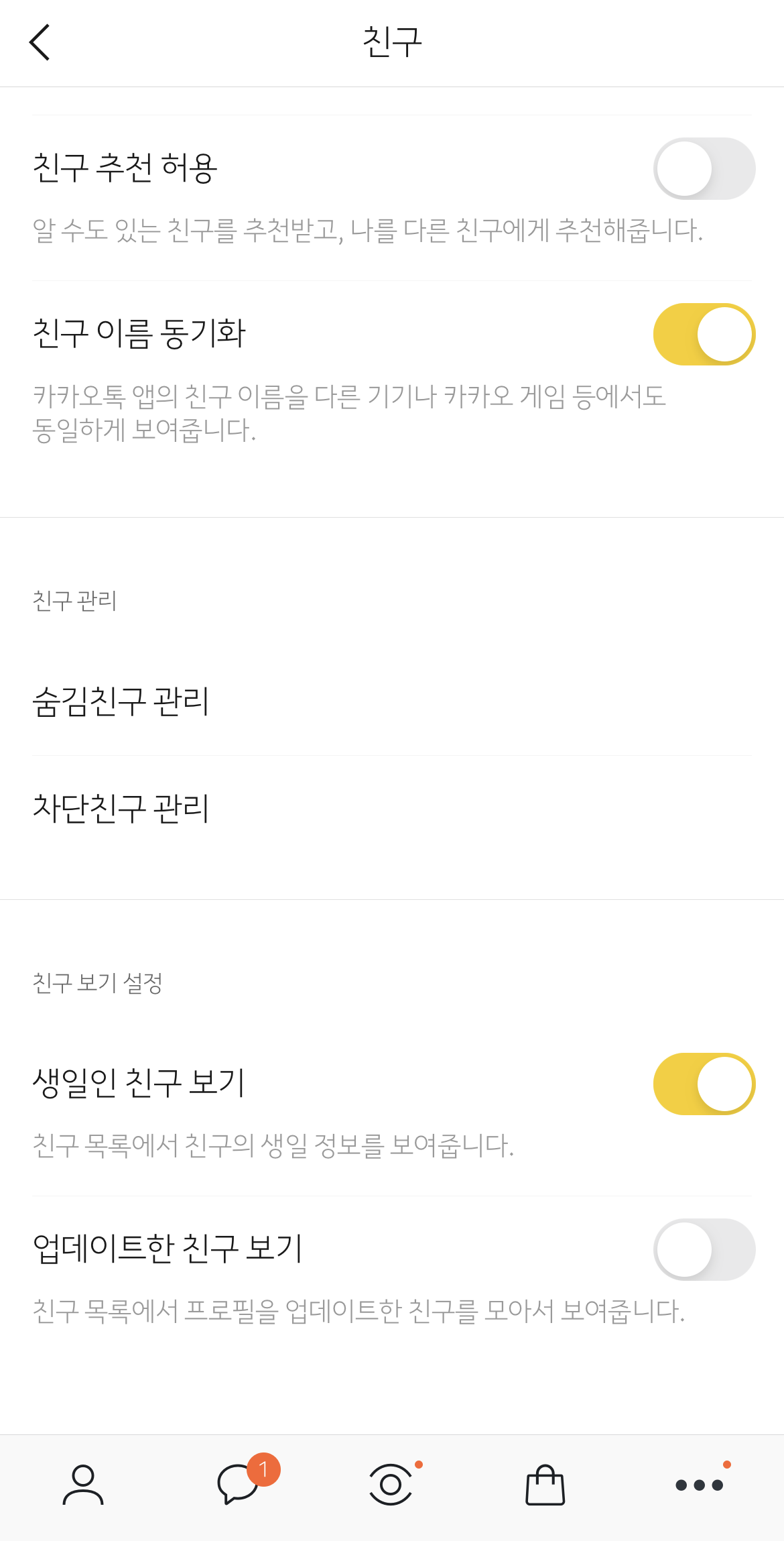 마찬가지로 생일인 친구 보기를 끄면 오른쪽과 같이 친구에서 생일인 친구가 더이상 뜨지 않아요. 생일인 친구와 업데이트한 친구를 보지 않으려면 위 내용을 토대로 수정하시면 되요~!