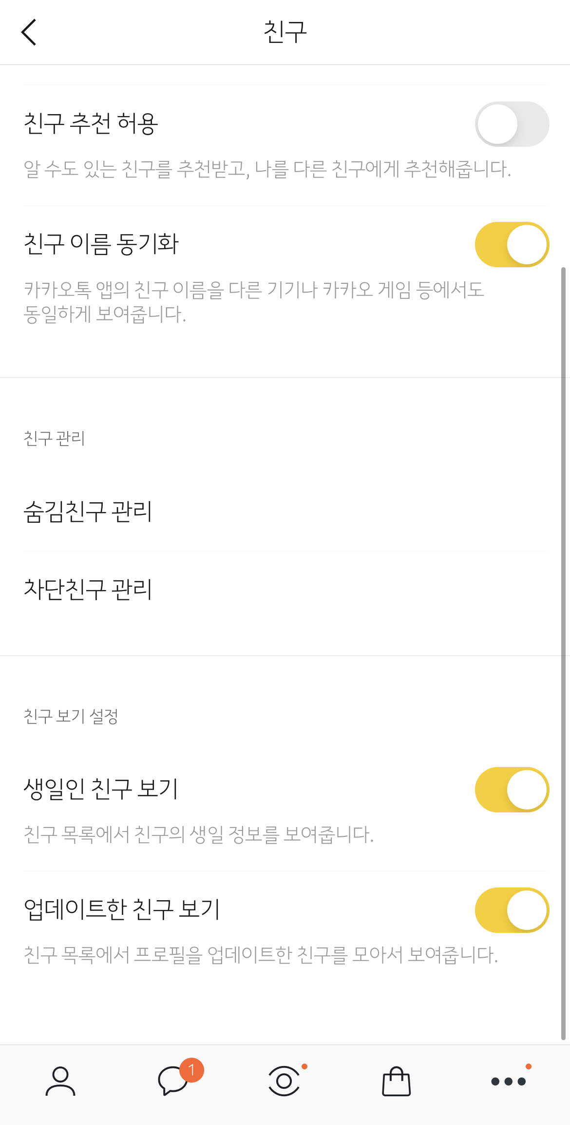 그럼 위 사진처럼 각종 카카오톡의 설정을 변경할 수 있는 공간이 나와요. 이곳에서 가운데쪽에 친구라는 카테고리가 있는데 이 부분에 들어가줍니다~