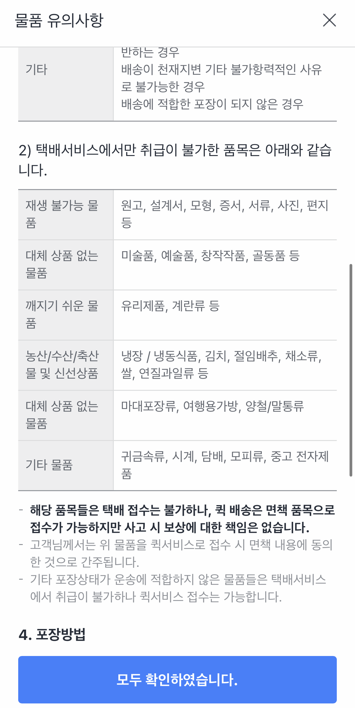 (그리고 위 오른쪽 사진 아래 물품 유의사항 자세히 보기 내용은 아래 이미지입니다.)