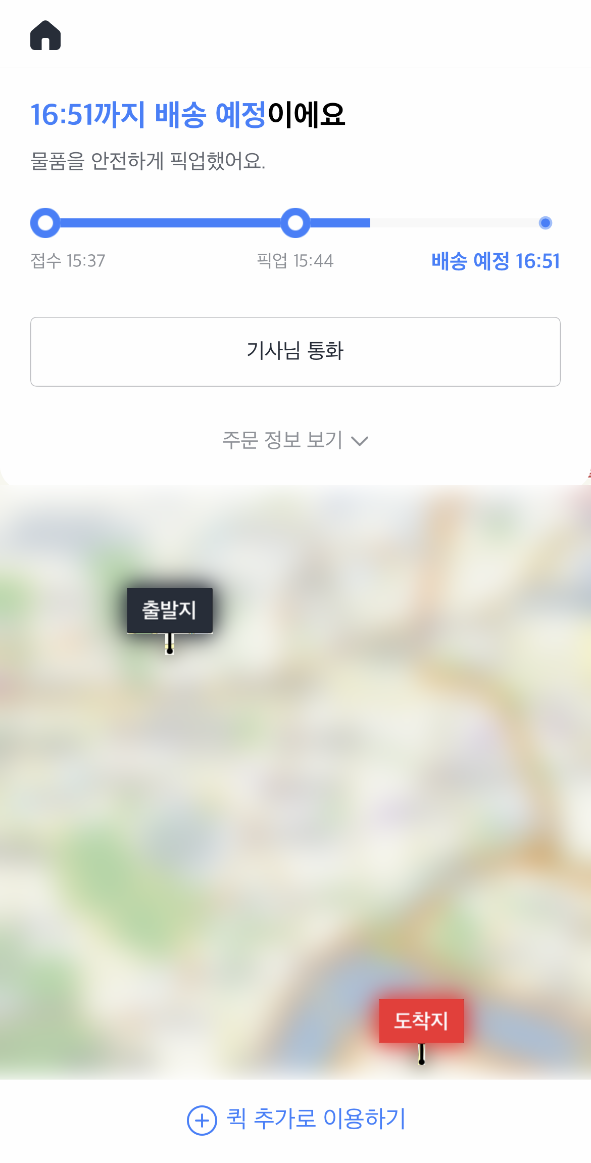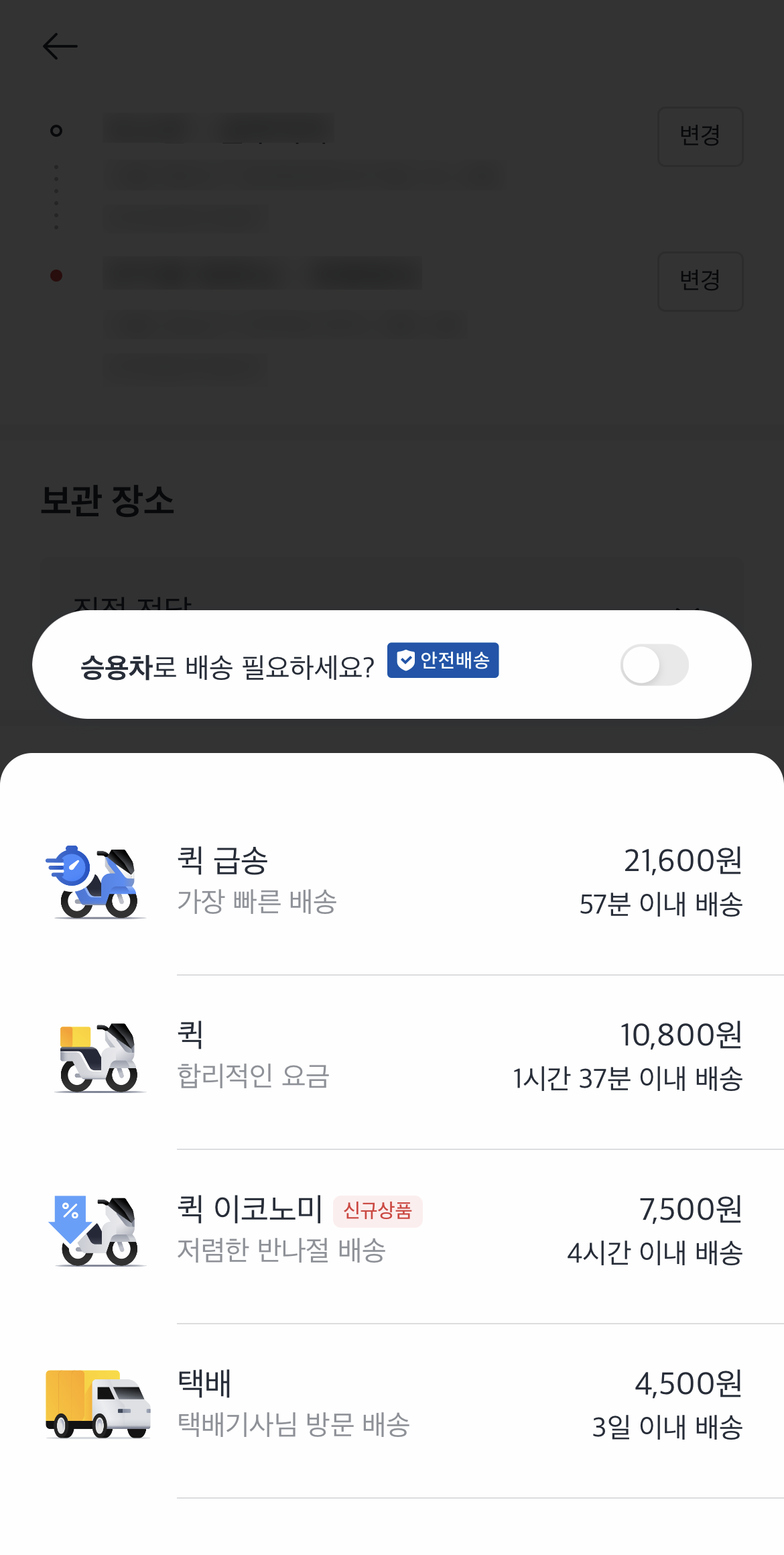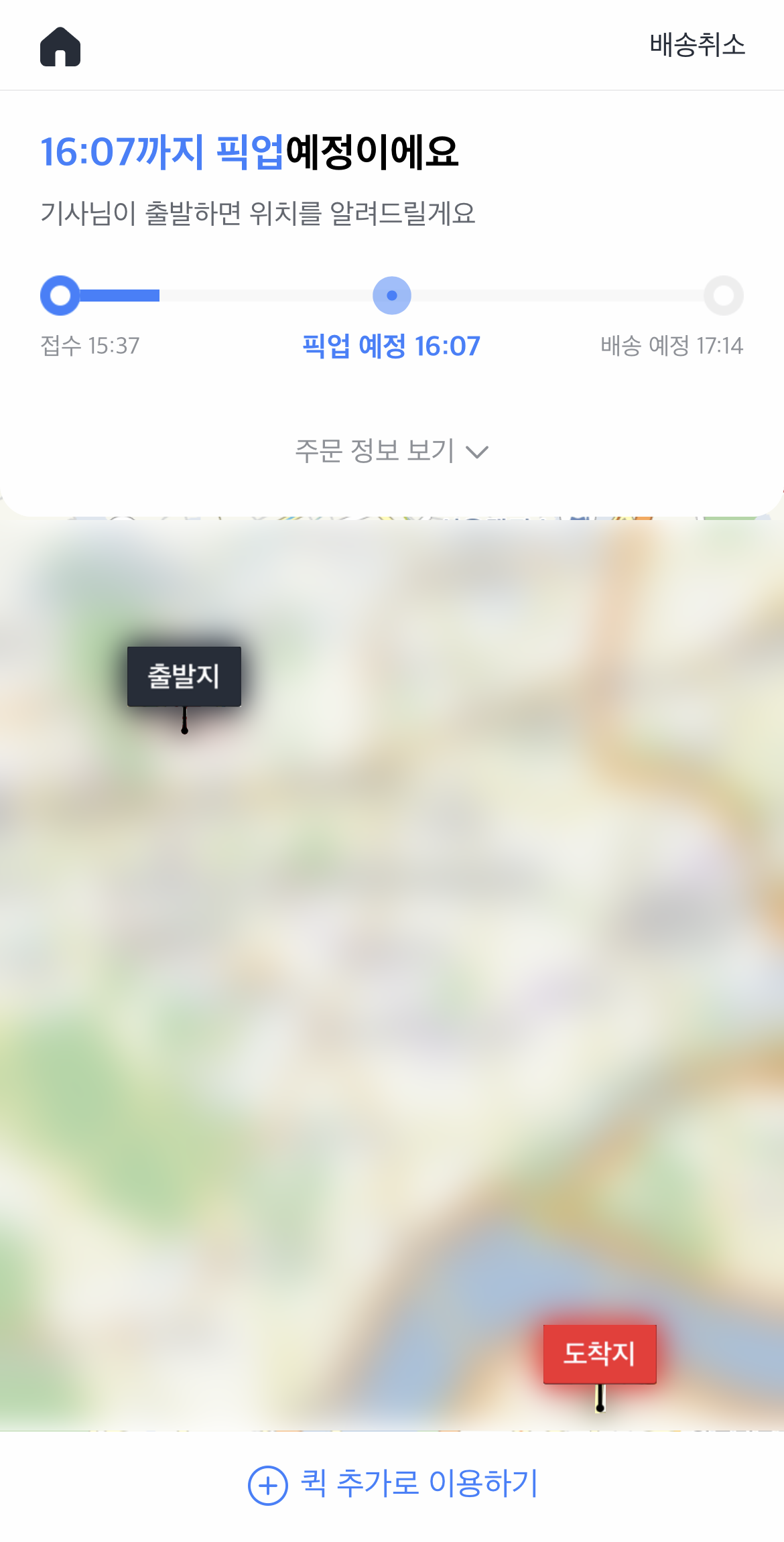 저는 엄청 급한건 아니고 오늘 안으로만 가면 되서 퀵 합리적인 요금을 선택했어요. 시간은 1시간 37분정도 걸린다고 하네요~ (실제로도 그정도 걸렸어요.)