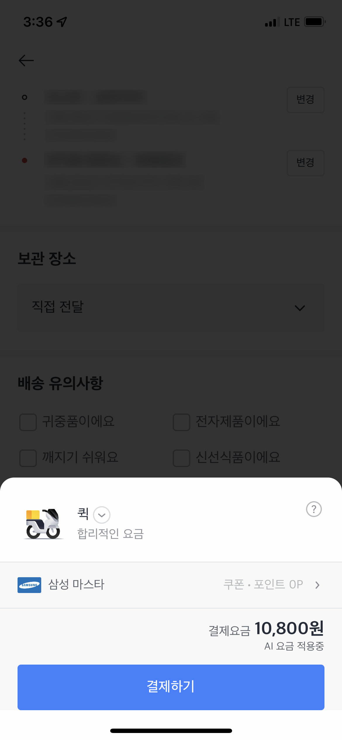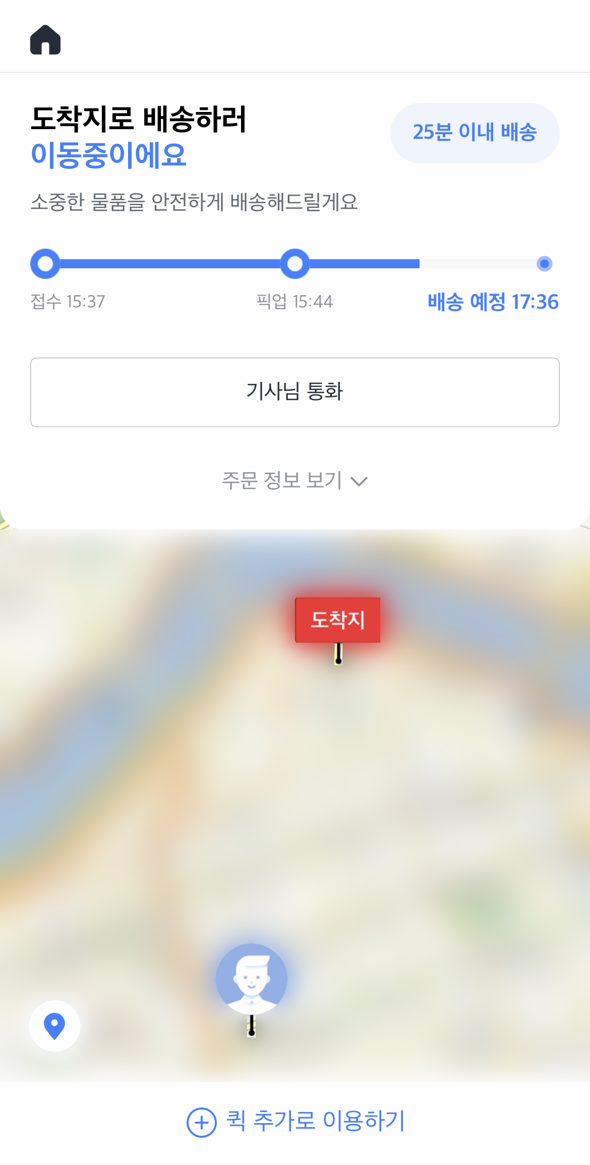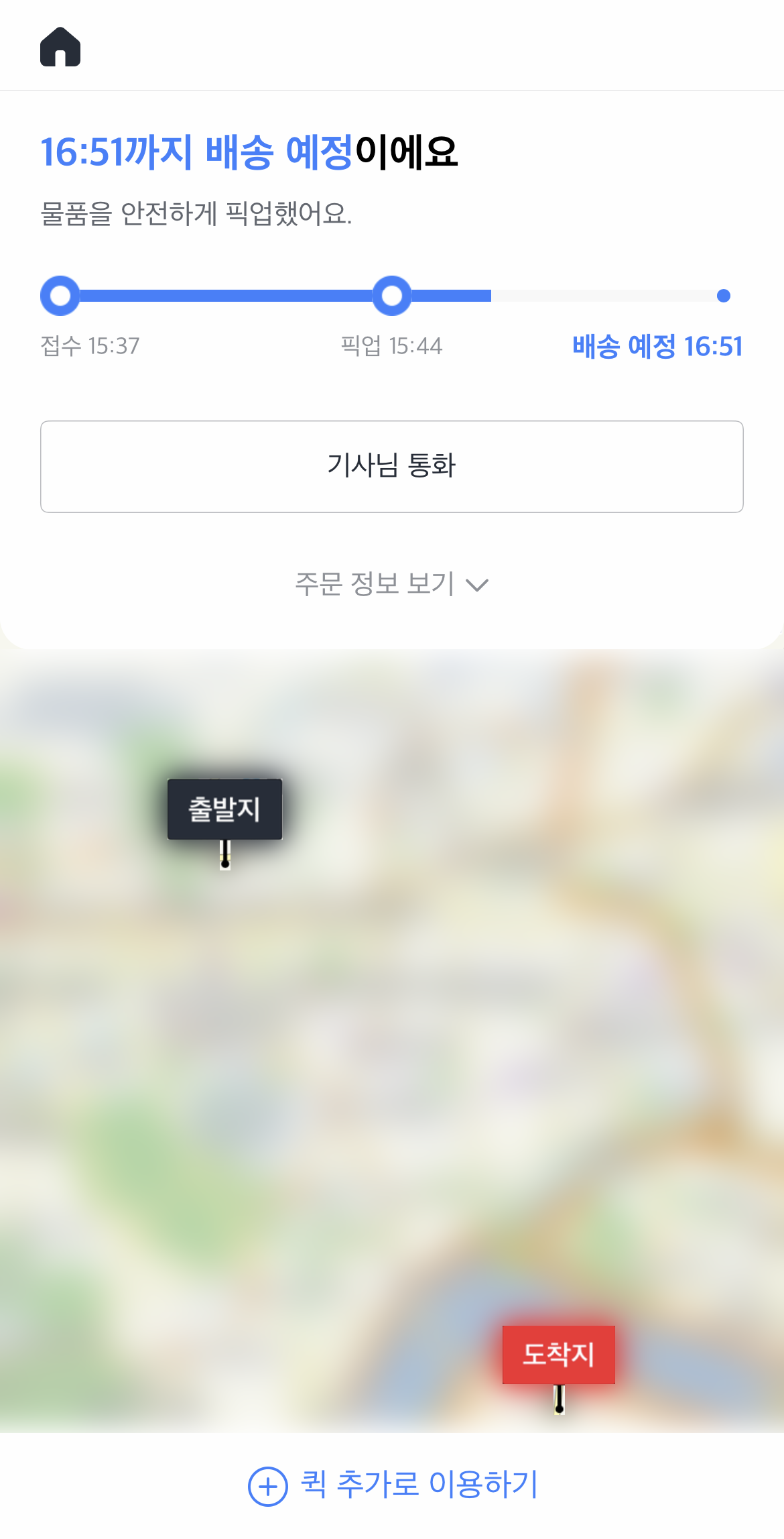 저는 엄청 급한건 아니고 오늘 안으로만 가면 되서 퀵 합리적인 요금을 선택했어요. 시간은 1시간 37분정도 걸린다고 하네요~ (실제로도 그정도 걸렸어요.)