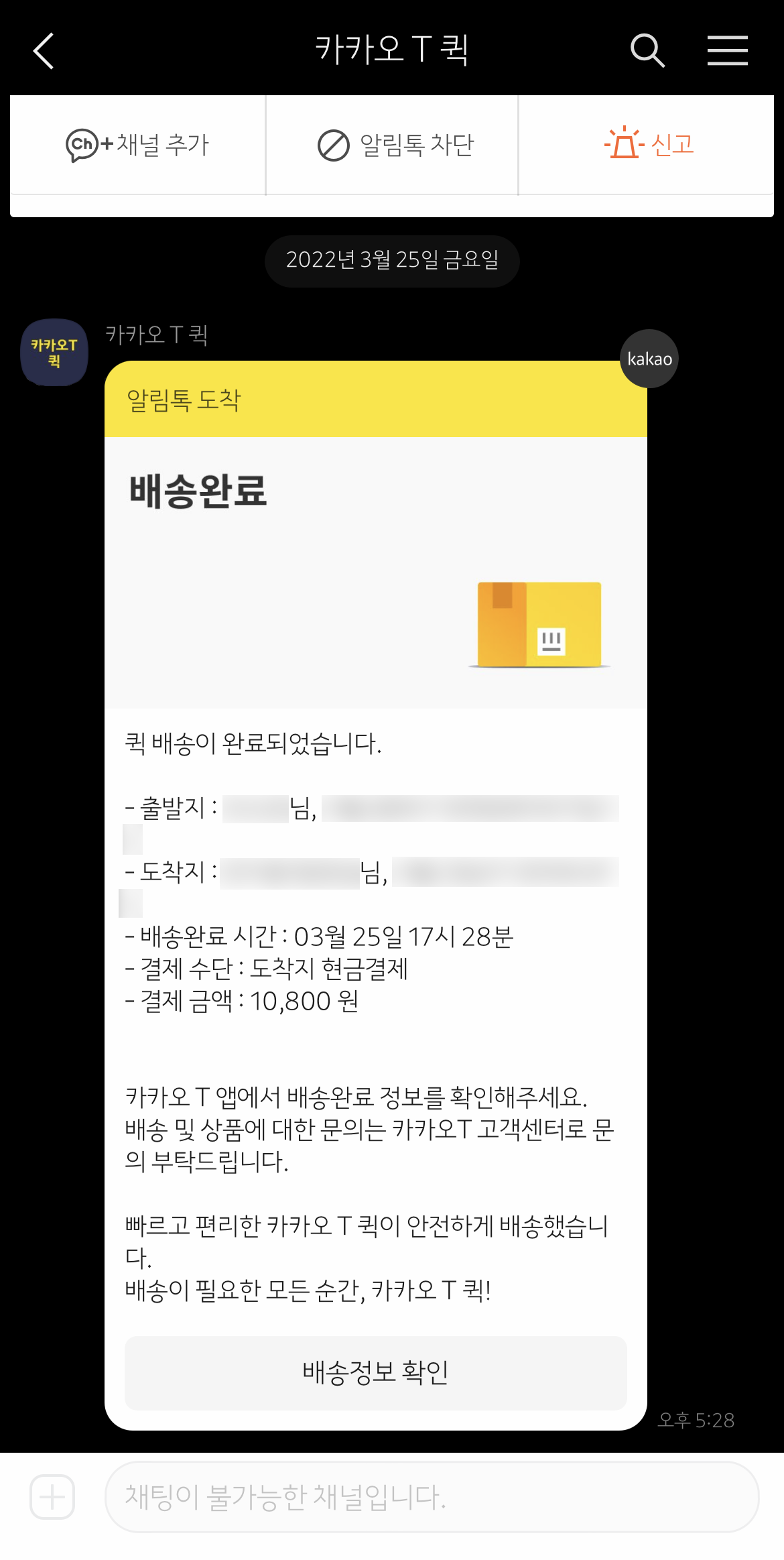 여기서 중요한 사실!!! 기사님이 픽업하시면 받는사람에게 카톡이 가더라구요~! 누가 퀵을 보냈고 얼마가 나왔는지두요!!