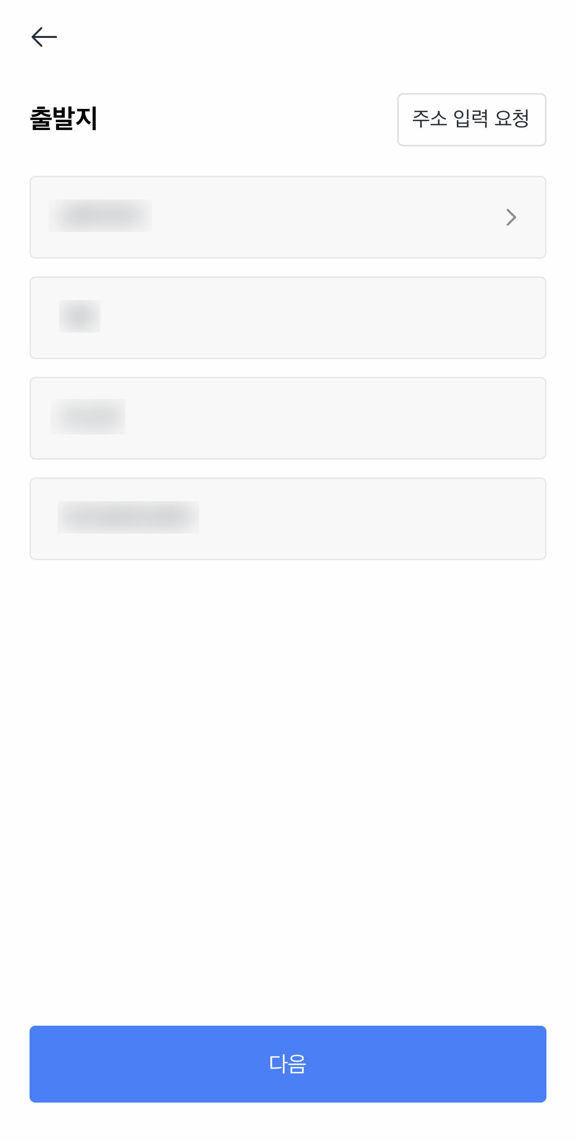 사이즈를 선택하면 바로 출발지 입력창이 떠요. 그럼 기사님이 오실 주소를 입력하고 다음을 눌러줍니다. 그 다음에 뜨는 도착지 입력창에도 똑같이 퀵 받으시는 분 주소도 입력해줍니다. 다음을 눌러줍니다.