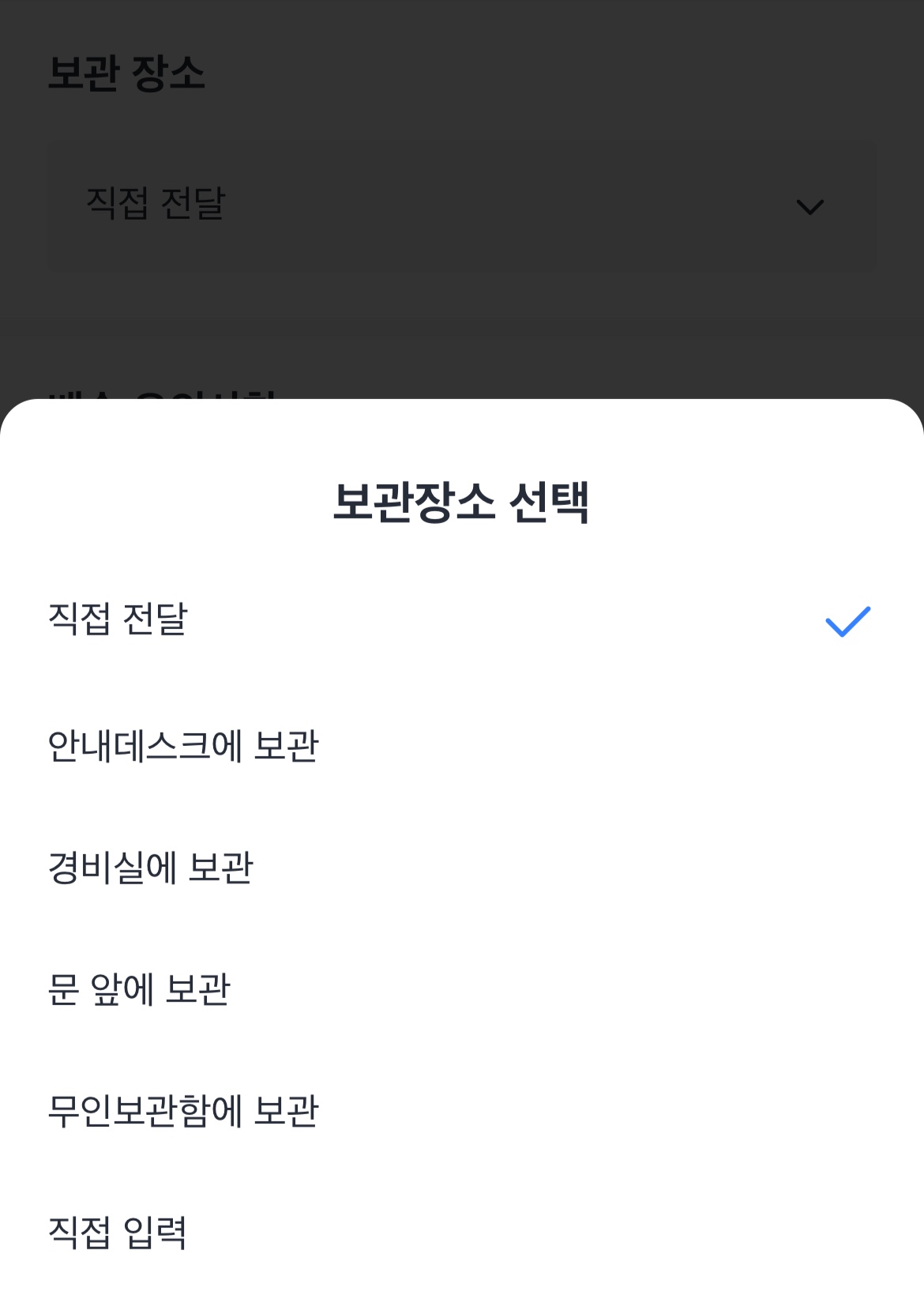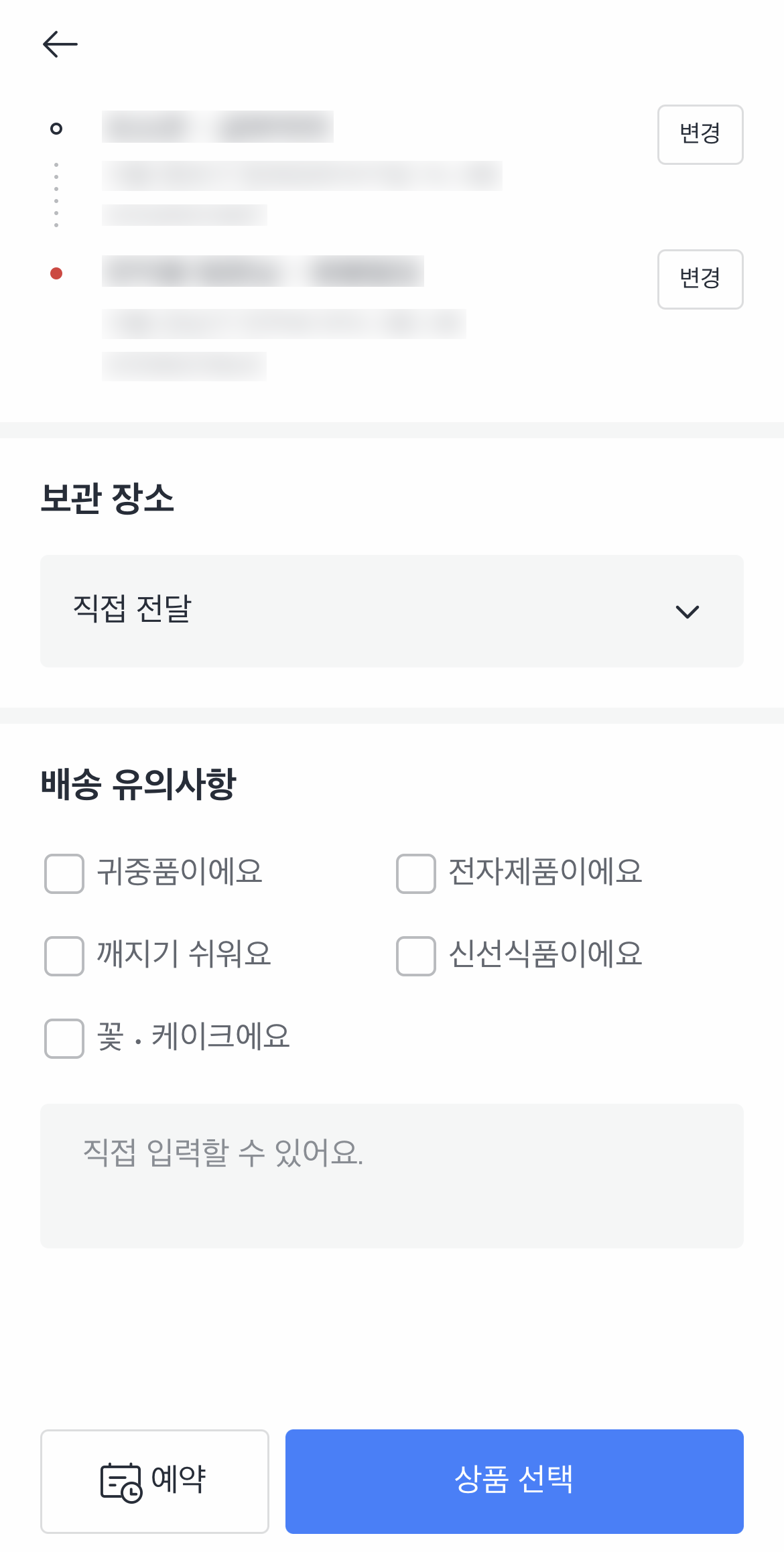 그 다음에는 보관장소와 배송유의사항을 선택할 수 있는데요.