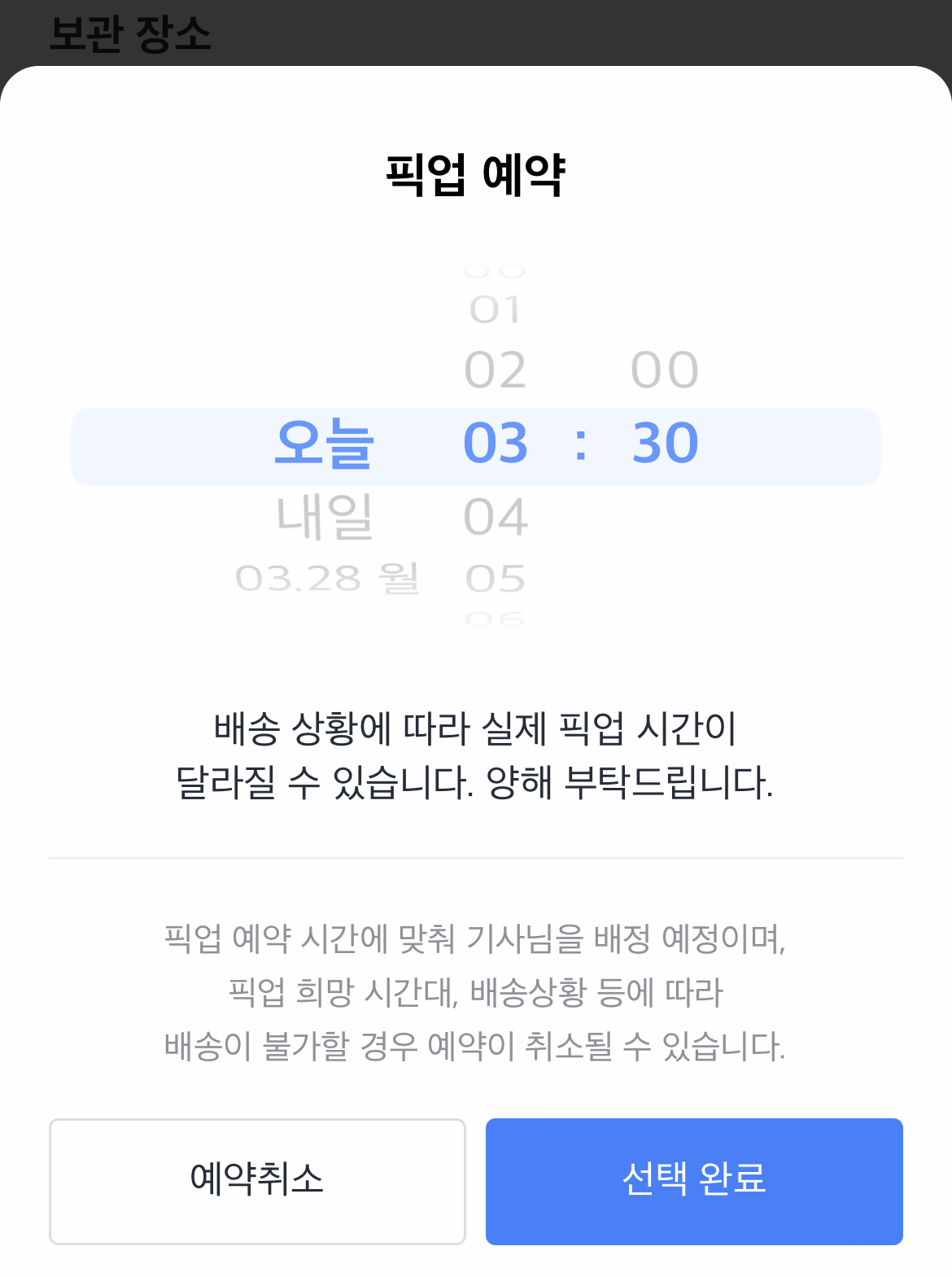 그리고 픽업 예약은 오늘, 내일, 모래 이렇게 3일정도만 예약이 가능합니다! 시간을 선택하고 아래 선택 완료를 눌러줍니다.