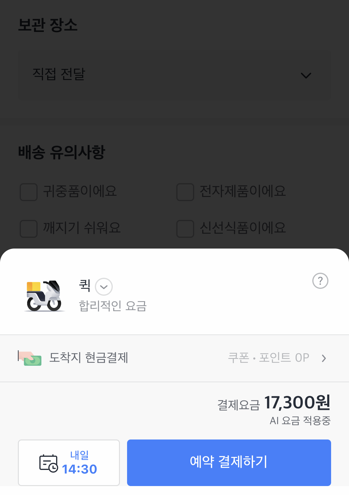보관장소와 물품유의사항을 작성한 후 아래 카카오퀵 예약을 눌러줍니다!!