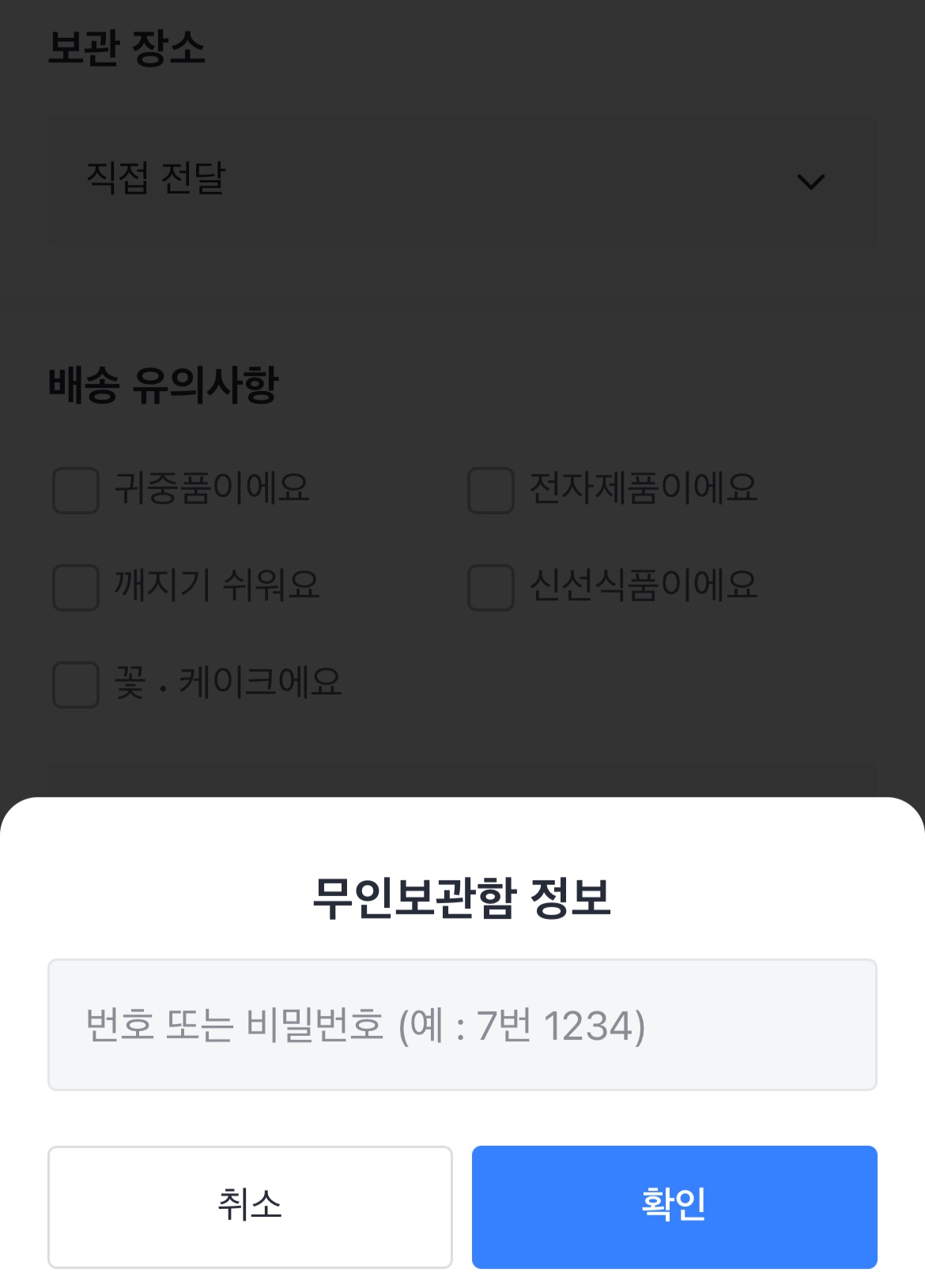 위 이미지처럼 보관장소 선택은 직접 전달, 안내데스크에 보관, 경비실에 보관, 문 앞에 보관, 무인보관함에 보관, 직접 입력 이렇게 6가지 옵션이 있어요. 만약 무인보관함에 보관을 누르면 무인보관함 정보를 추가로 적을 수 있더라구요~