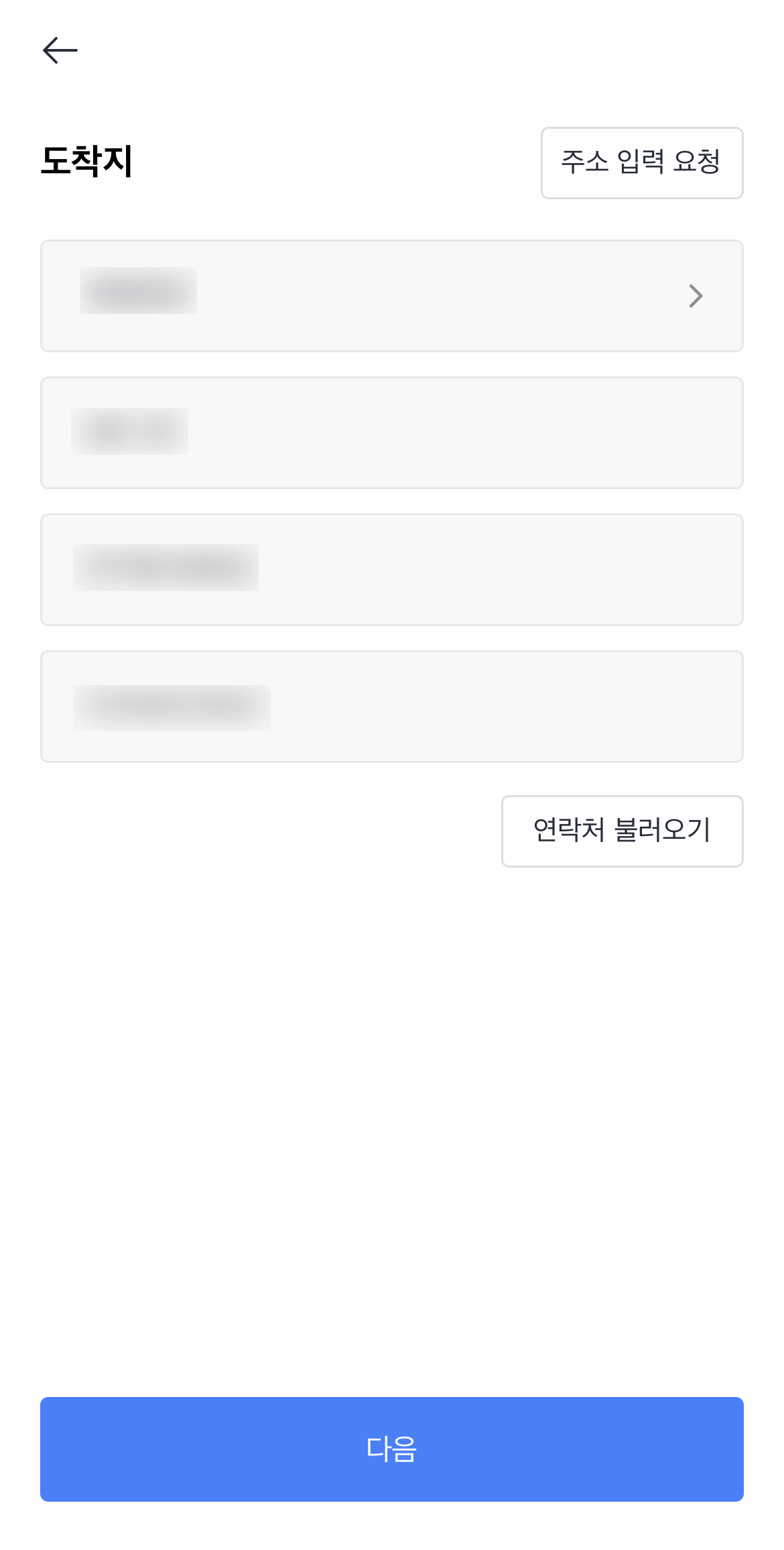 사이즈를 선택하면 바로 출발지 입력창이 떠요. 그럼 기사님이 오실 주소를 입력하고 다음을 눌러줍니다. 그 다음에 뜨는 도착지 입력창에도 똑같이 퀵 받으시는 분 주소도 입력해줍니다. 다음을 눌러줍니다.
