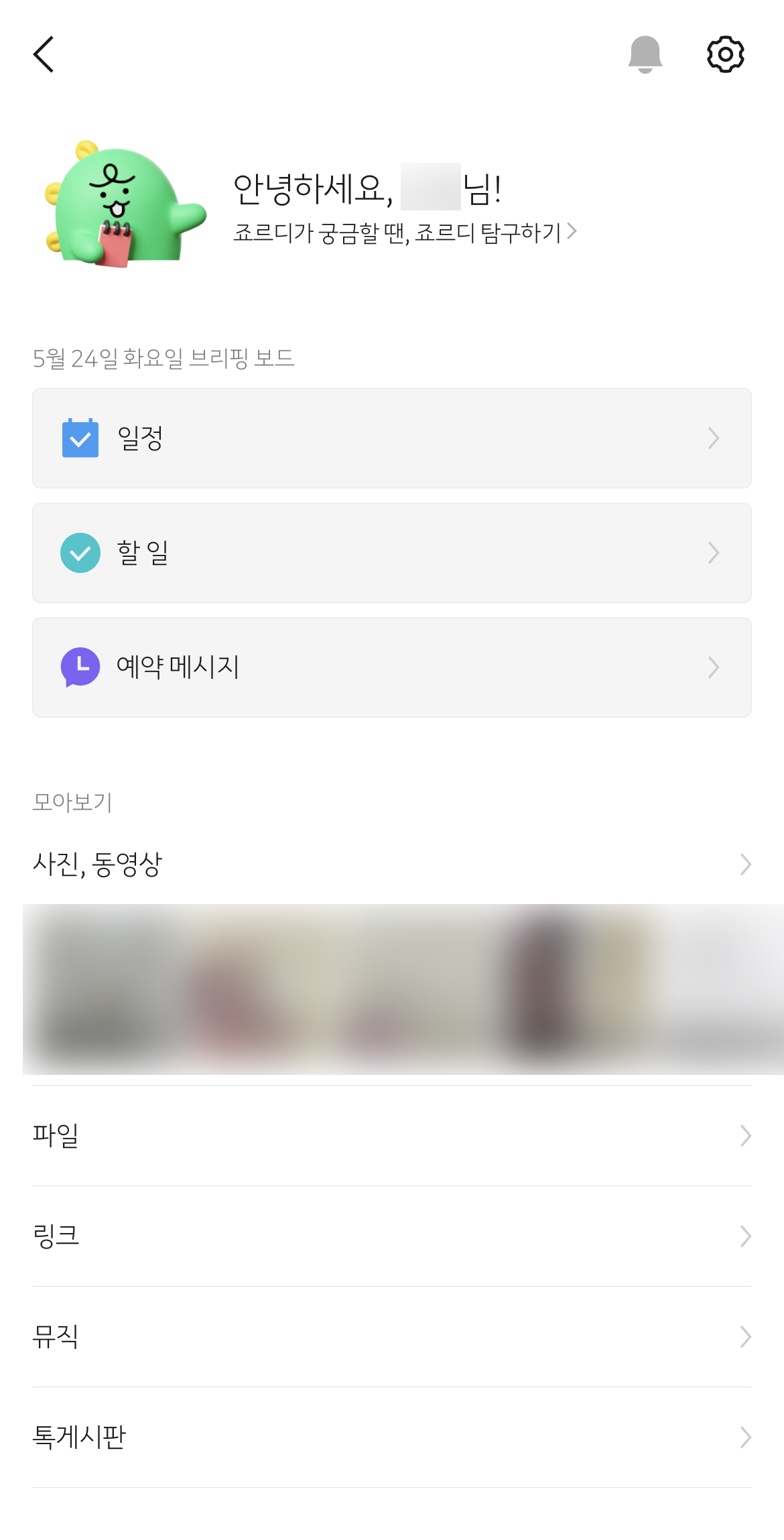 본인 (내 자신과의 카톡방) 카톡방에 들어가면 오른쪽 상단에 작대기 3개 (메뉴) 아이콘이 있습니다. 이부분을 누르게 되면 오른쪽 이미지와 같이 죠르디 톡비서가 짠 하고 나타납니다. 죠르디 아래 브리핑 보드가 있습니다. 일정, 할일, 예약 메시지가 있는데요~